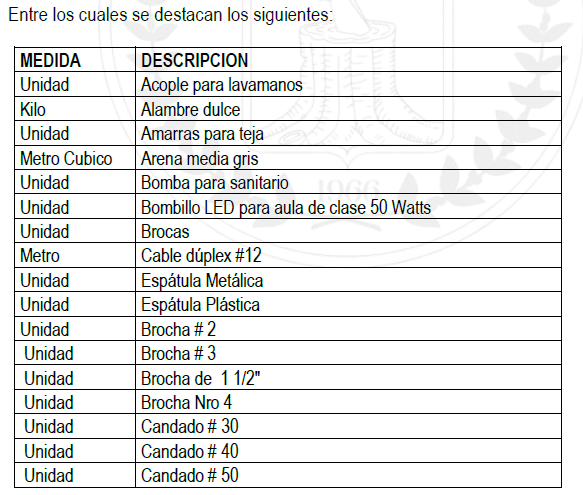 La Institución Educativa invita a todos los interesados, que demuestren capacidad contractual, a presentar ofertas para el siguiente proceso contractual. OBJETO: Suministro de materiales hidráulicos, sanitarios, eléctricos, de ferretería y de construcción requeridos para el proceso de conservación, embellecimiento, mantenimiento preventivo y correctivo de la infraestructura física de la institución educativa y; para la implementación y ejecución de centros de interés enmarcados dentro del componente de Formación Integral.